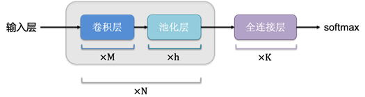 一个基本的卷积神经网络通常是由卷积层、池化层和全连接层交叉堆叠而成。如图5所示,由连续个卷积层和个池化层构成一个卷积块(M的取值一般为1~5,h的取值一般为0或1),一个卷积神经网络中可以堆叠N个连续的卷积块(N的取值可以很大,较深的网络可以达到100多层)。在N个连续的卷积块之后是K个连续的全连接层(K一般取1~2)。