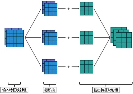 在卷积层中,特征图(feature map,又称为特征映射)是输入层的图像(或其它的特征图)经过卷积之后得到的特征输出。一个卷积核只负责提取某一类特定的特征,为了充分的提取出图像中的信息,我们通常会使用多个卷积核。卷积层的一般性结构可以表示如下:
