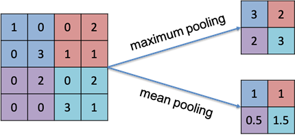 如图4是一个最大池化和均值池化的示例,这里我们将一个特征映射划分为了4个区域,即池化窗口的大小为2x2,步长为2。