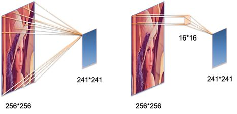 如图1所示,假设输入到神经网络中的是一张大小为256*256的图像,第一层隐藏层的神经元个数为241*241。在只考虑单通道的情况下,全连接神经网络输入层到第一层隐藏层的连接数为,也就是说输入层到第一层隐藏层有个参数(1为偏置项参数个数)。而在卷积神经网络中,假设我们使用了一个大小为16*16的卷积核,则输入层到第一层隐藏层的连接数为,由于我们的卷积核是共享的,因此参数个数仅为个。有时候为了提取图像中不同的特征,我们可能会使用多个卷积核,假设这里我们使用了100个大小为16*16的卷积核,则输入层到第一层隐藏层的参数个数也仅为,这依然远远少于全连接神经网络的参数个数。