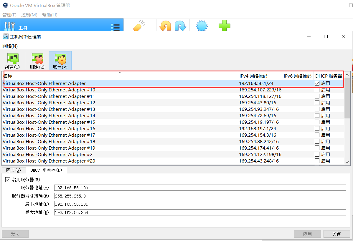 通过virtual box工具,点击管理选型里的主机网络管理器,看到如下内容。