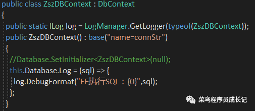 d. 在Application_Start中注册log4net后,就可以自动记录未捕获异常了,级别为ERROR。但在有些地方需要记录DEBUG级别日志时,要手写代码,比如要在DBContext中记录查询SQL: