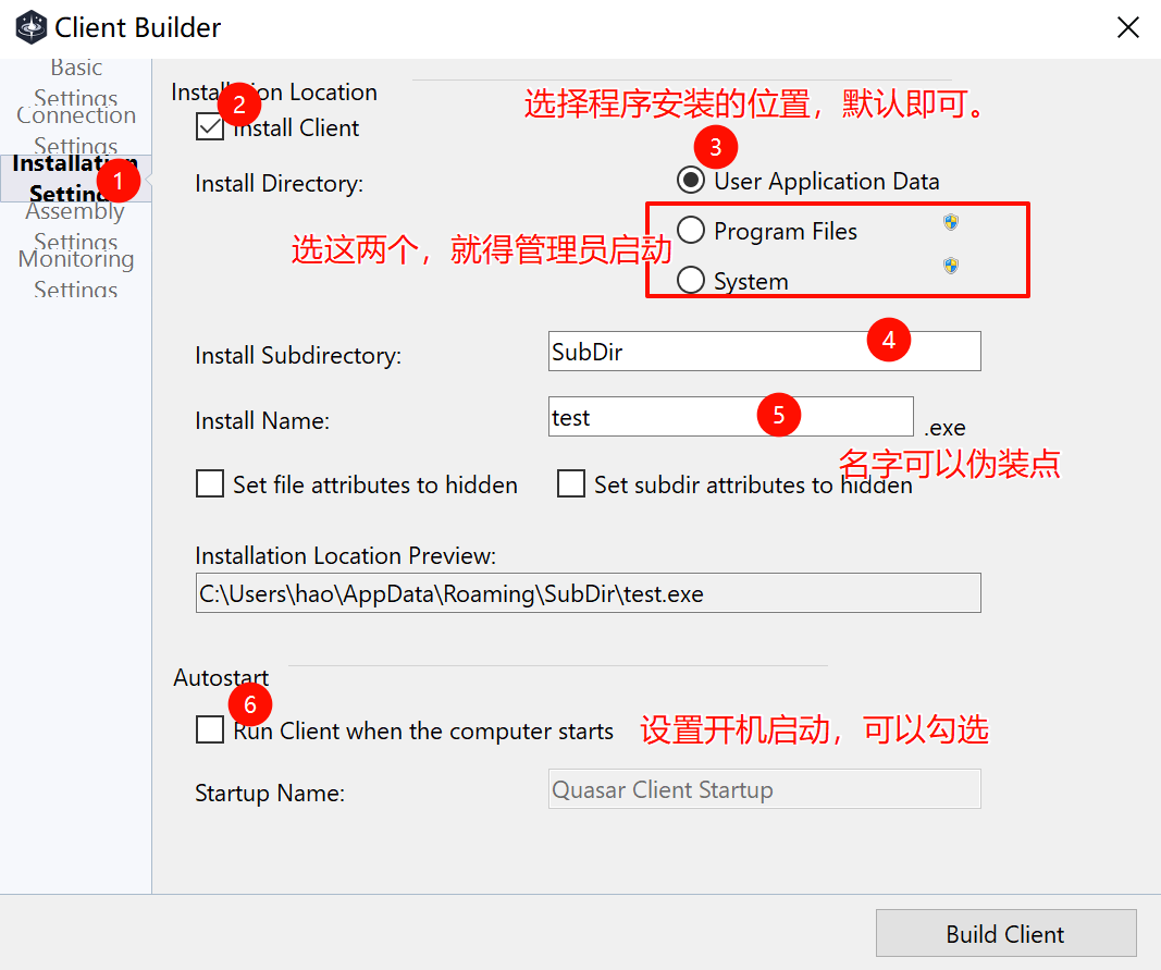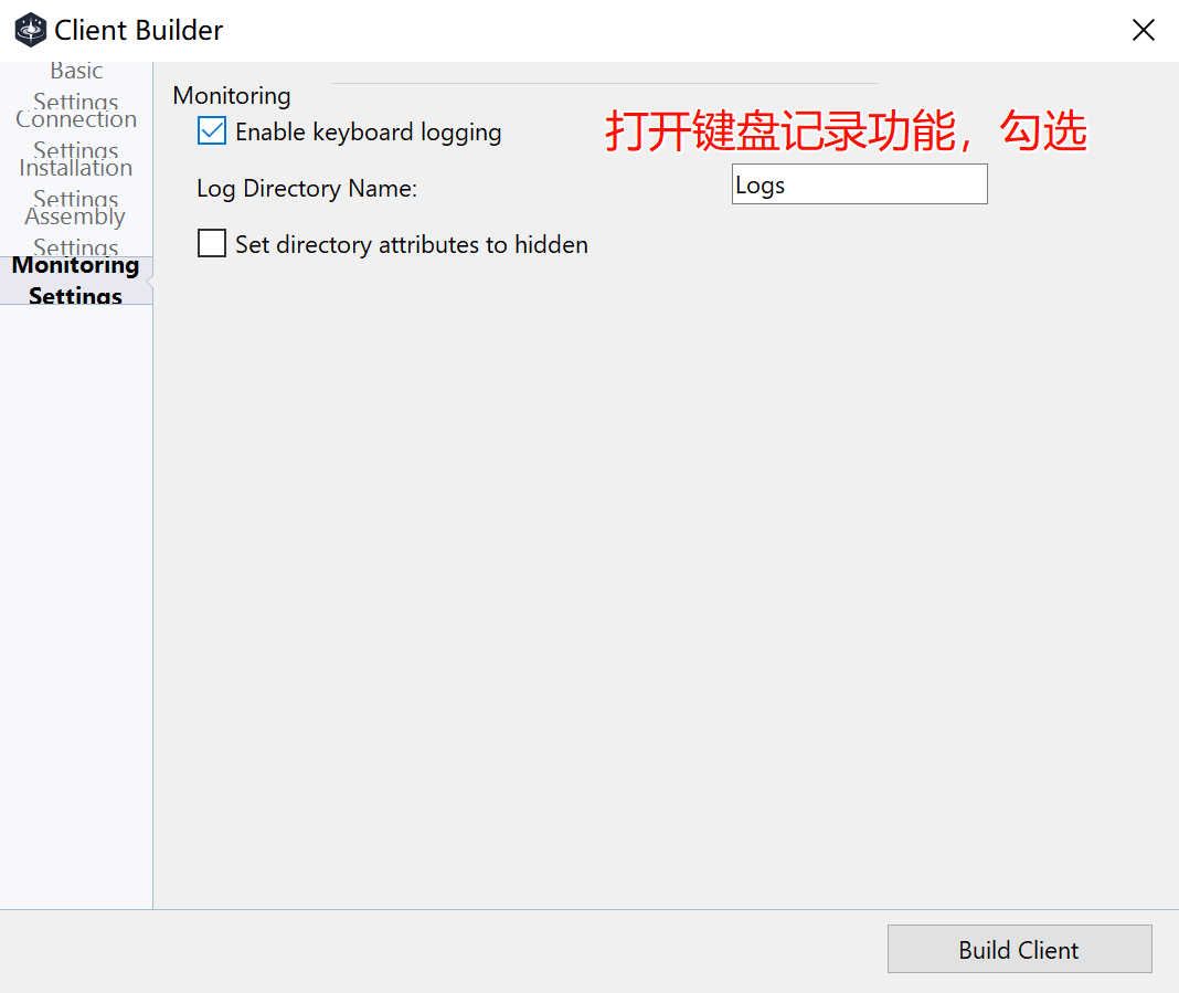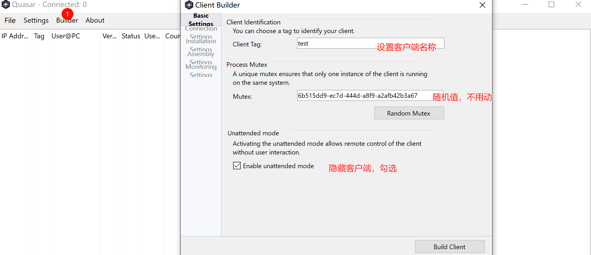 下一步,点击Build Client即可生成引导程序,发送给目标PC即可: