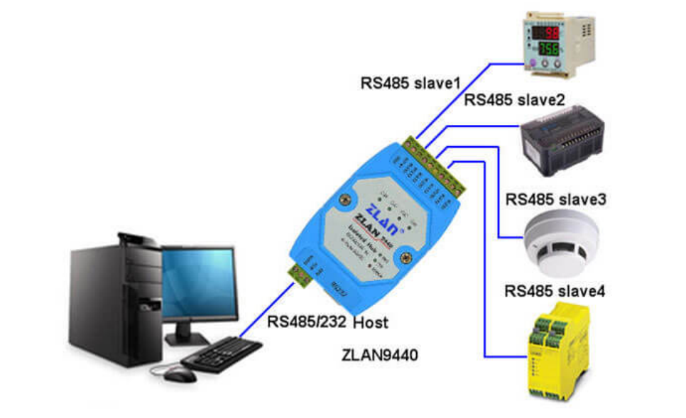 ZLAN9440的主口端同时提供隔离型RS485和RS232两种接口,从口端扩展出4路隔离型RS485接口。