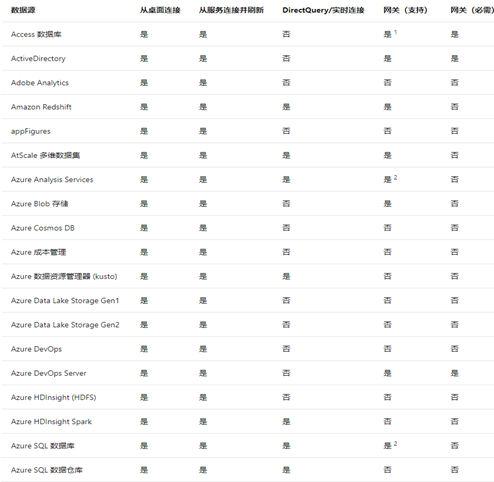 下表展示了 Power BI 支持的数据源,其中包括有关 DirectQuery 和本地数据网关的信息。