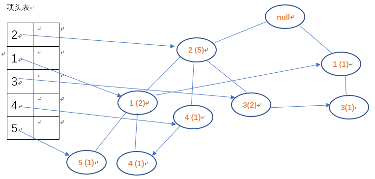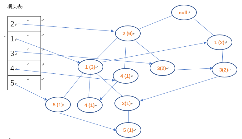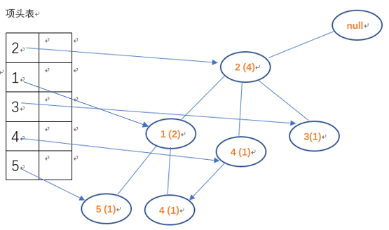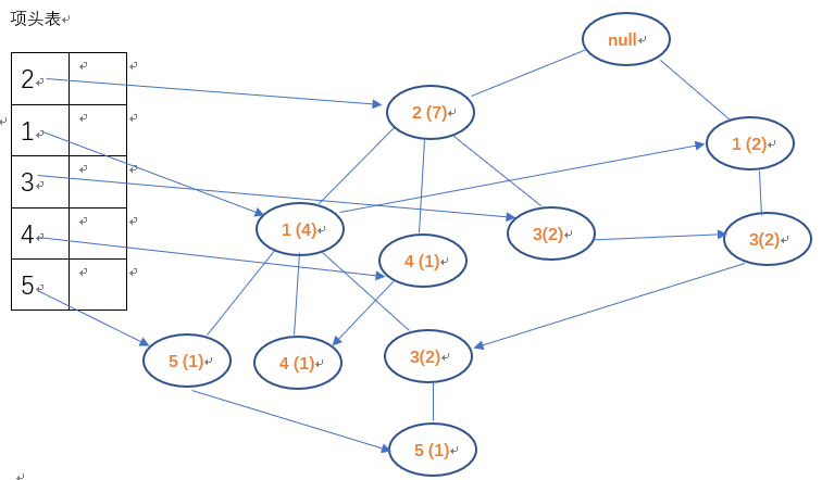 然后构建FP-Tree树(最小支持度计数为2),同时构建项头表,项头表按支持度计数排序好(无箭头的表示树之间的连线,有箭头的表示链表之间的连线):