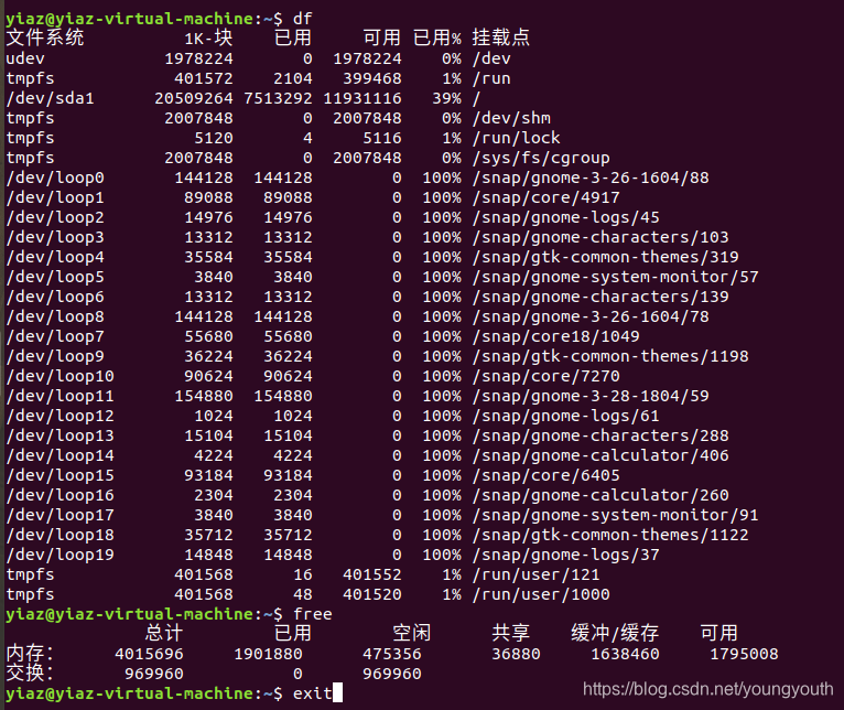 date打印系统时间cal打印当前日期的日历形式df磁盘剩余空间free空闲内存空间exit退出终端,即关闭终端