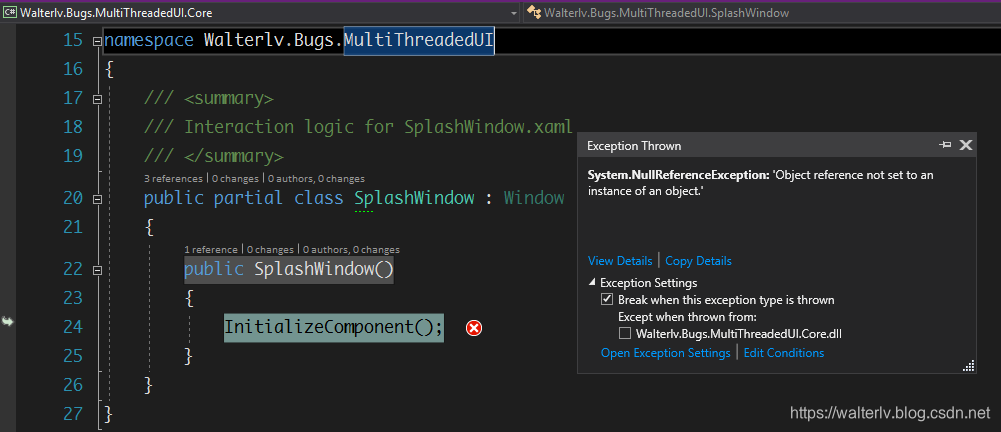 at Walterlv.Bugs.MultiThreadedUI.SplashWindow..ctor() in C:\Users\lvyi\Desktop\Walterlv.Bugs.MultiThreadedUI\Walterlv.Bugs.MultiThreadedUI\SplashWindow.xaml.cs:line 24