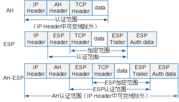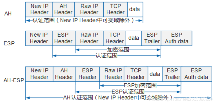 当安全协议同时采用AH和ESP时,AH和ESP协议必须采用相同的封装模式。