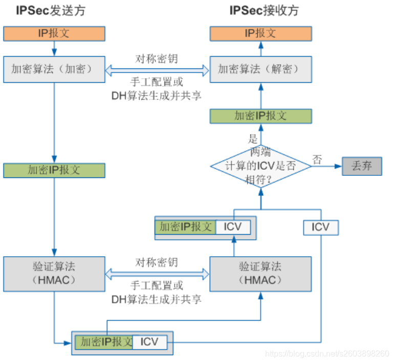 IPSec的加密功能,无法验证解密后的信息是否是原始发送的信息或完整。IPSec采用HMAC(Keyed-Hash Message Authentication Code)功能,比较数字签名进行数据包完整性和真实性验证。