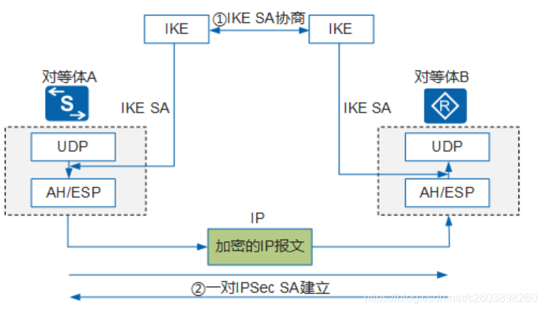IKE SA是一个双向的逻辑连接,两个对等体间只建立一个IKE SA。