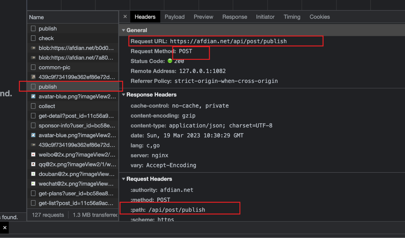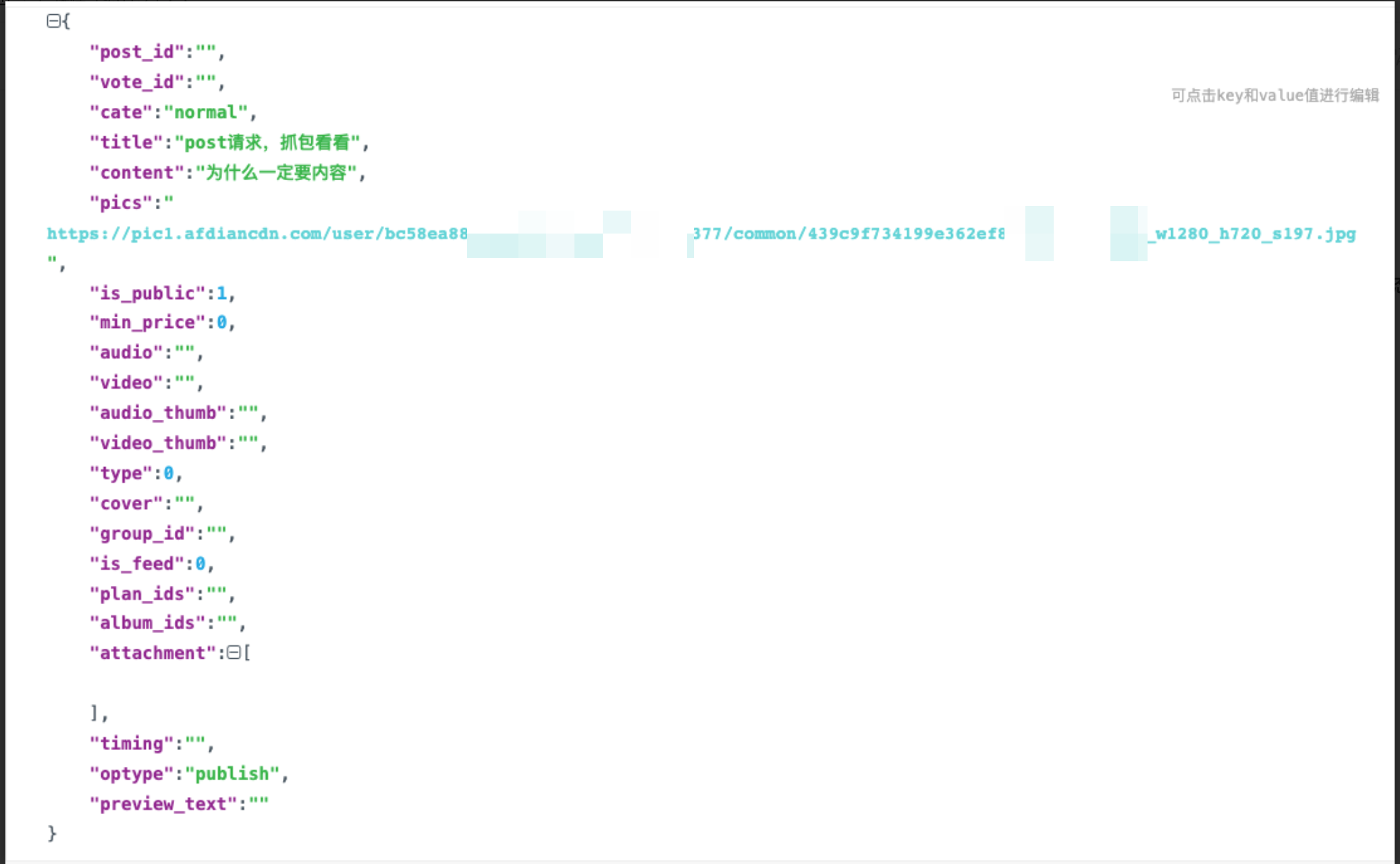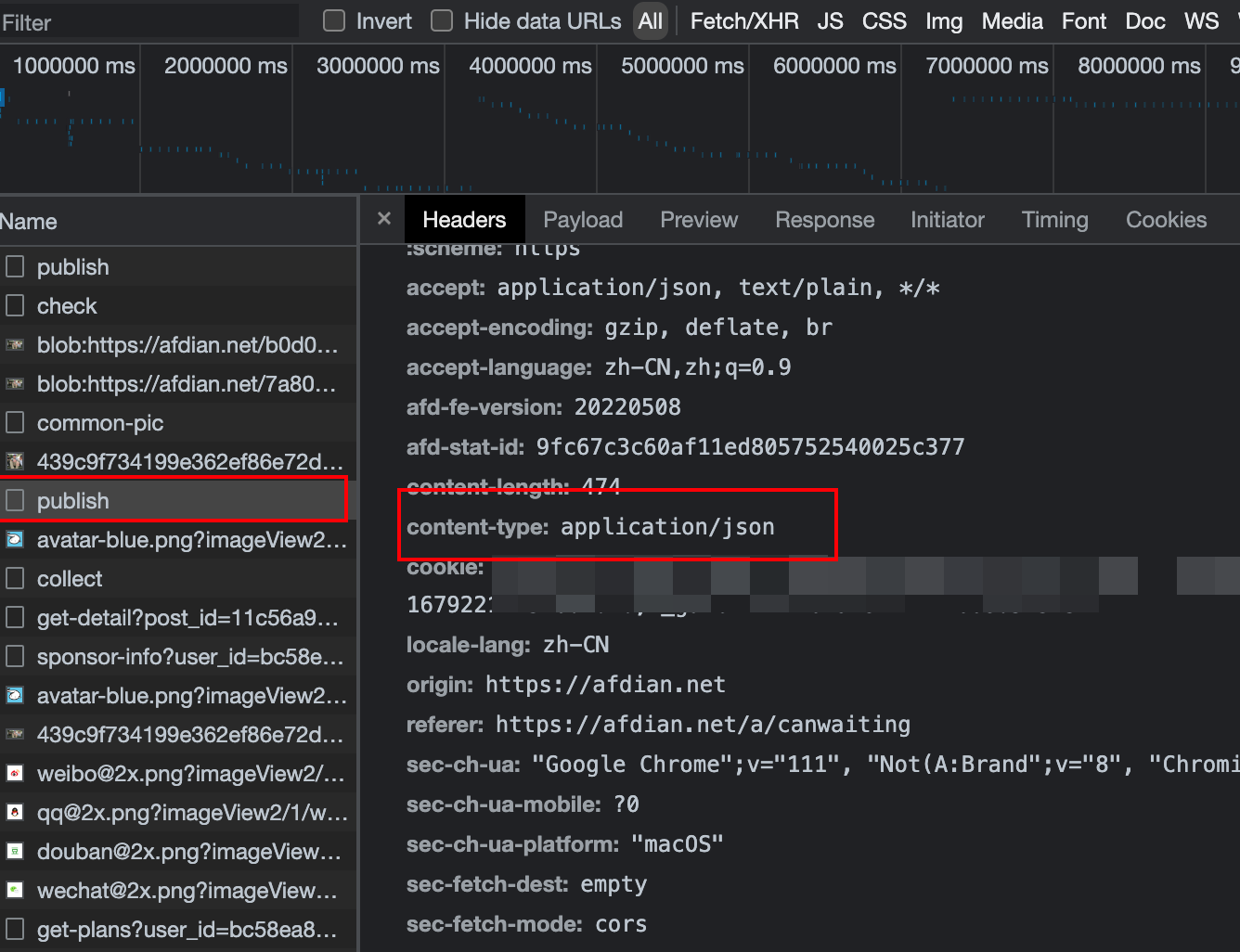 可以看到这个发布动态的请求地址为:https://afdian.net/api/post/publish,接下来我们看看我们的请求体是什么