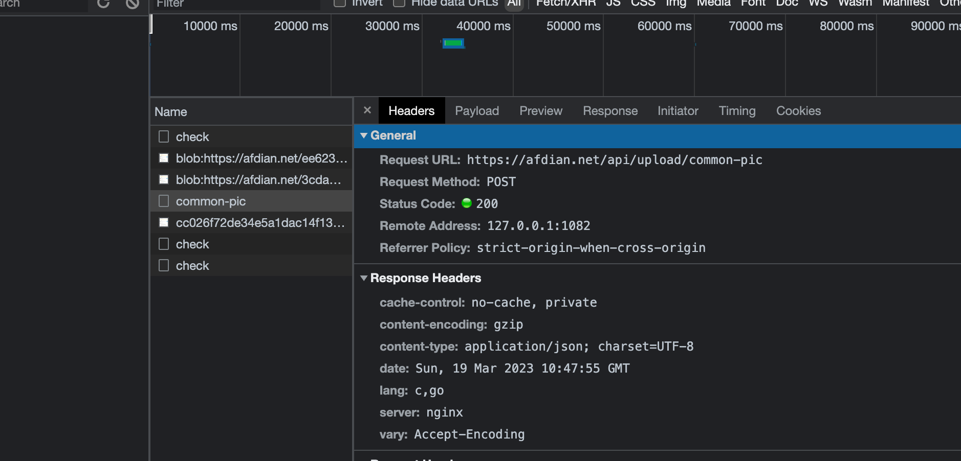可以看到这个表单挺简单的,但是有一个不太对劲的情况,就是字段"pics"的值不是我上传的地址的值("./img.jpg"),所以我猜,在调用api/post/publish接口前肯定调用了某个接口,将本地的图片转换成上图的链接,然后再拼接到上图中的字段"pics"中一起提交