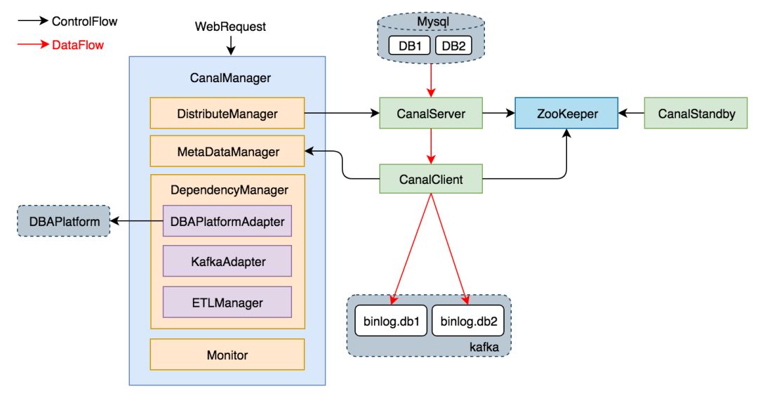对Binlog的实时采集包含两个主要模块:一是CanalManager,主要负责采集任务的分配、监控报警、元数据管理以及和外部依赖系统的对接;二是真正执行采集任务的Canal和CanalClient。