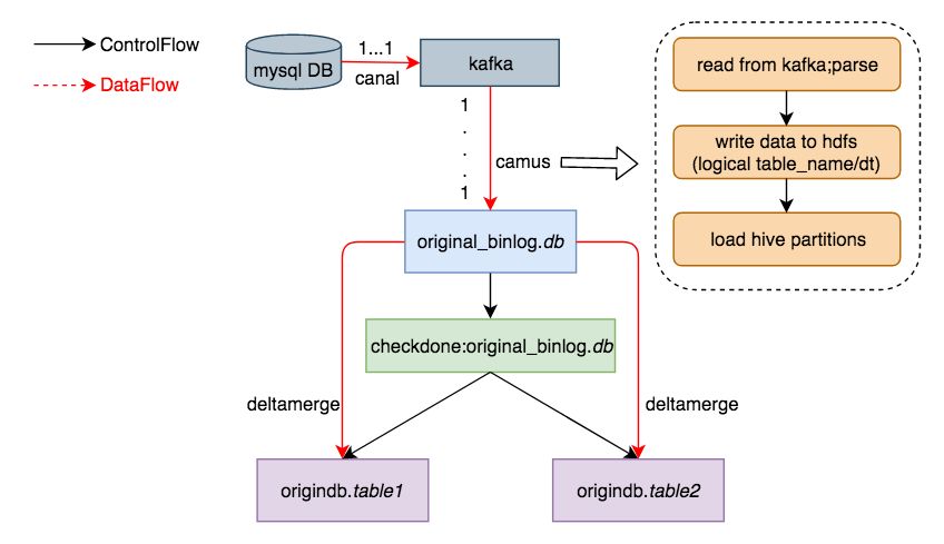 采用Linkedin的开源项目Camus,负责每小时把Kafka上的Binlog数据拉取到Hive上。