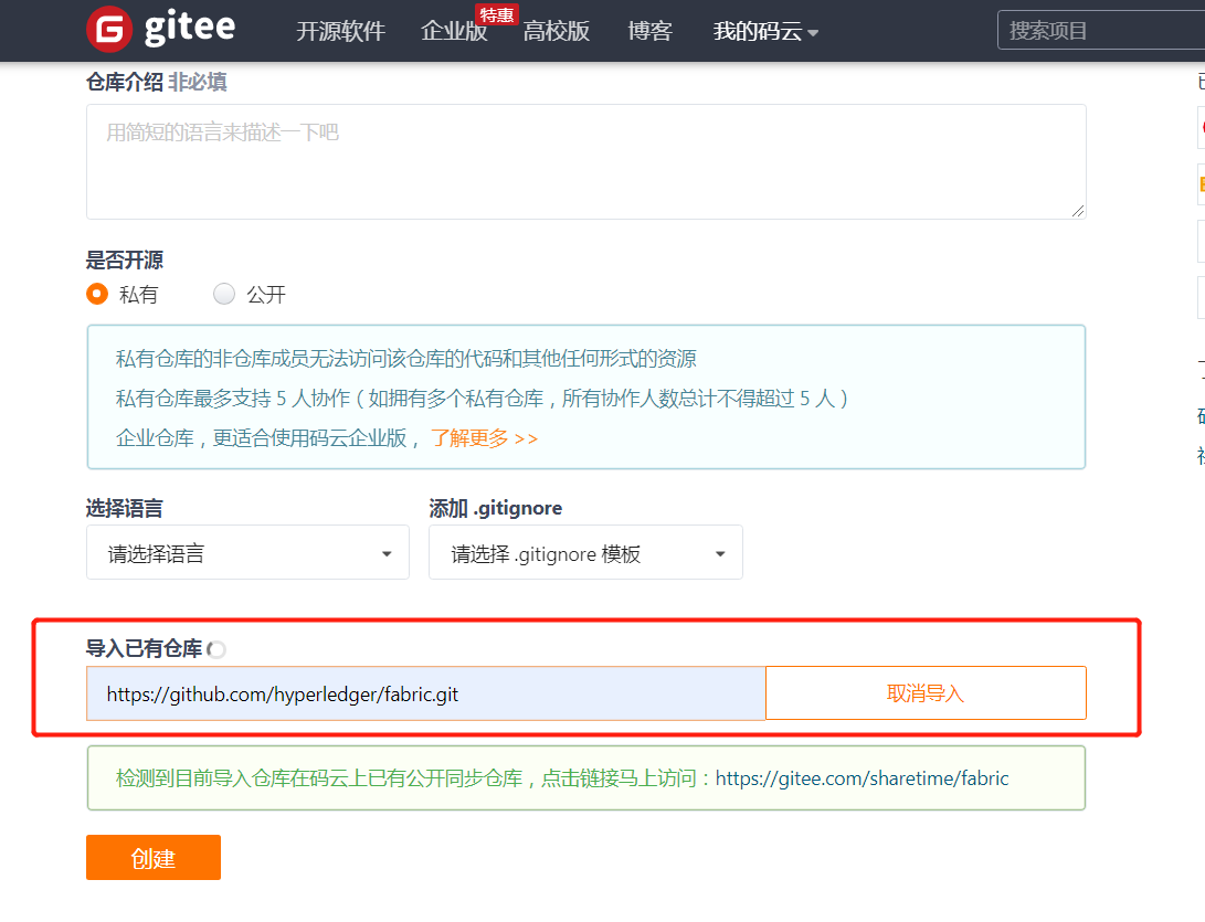 - 在码云中创建仓库,选择导入已有仓库(如下图)