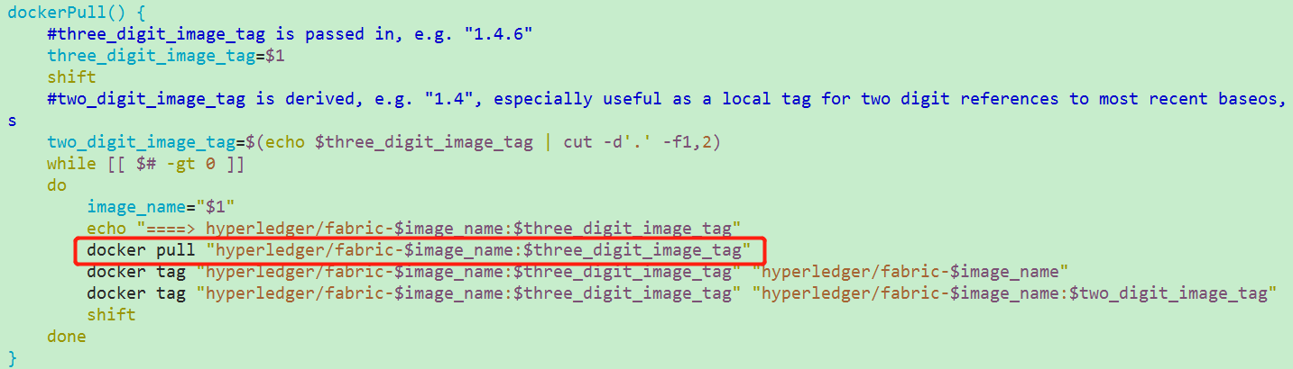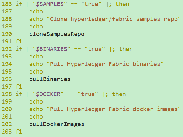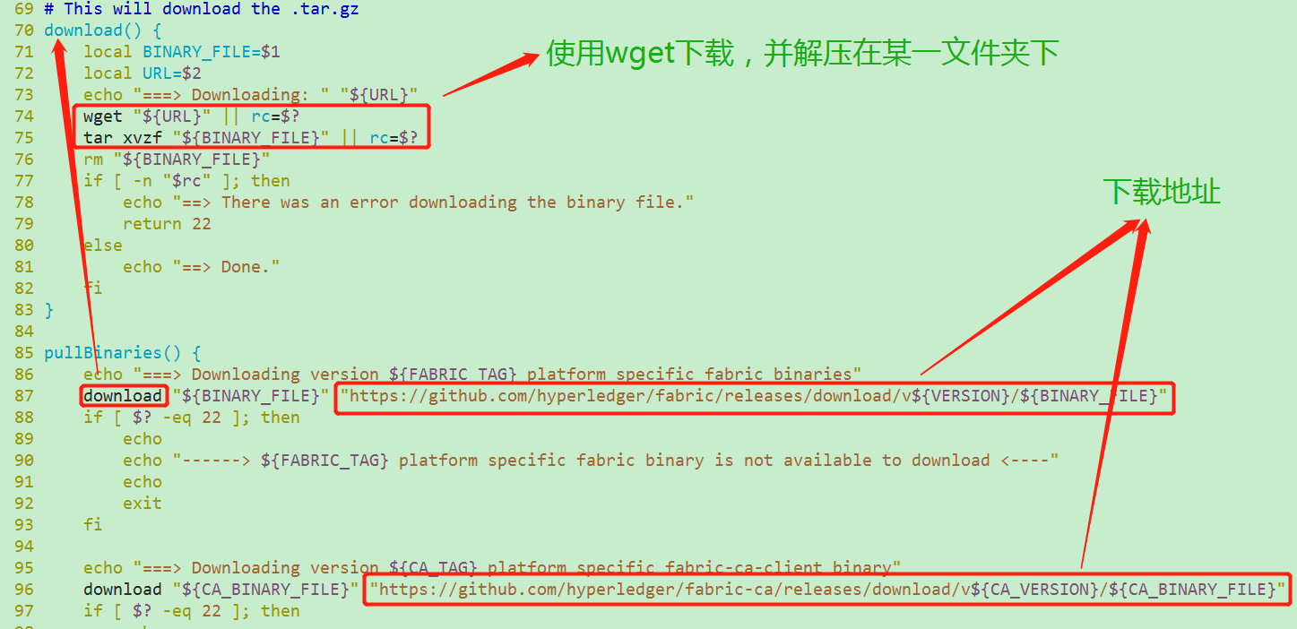 fabric-sample第二节已经讲到,这里跳过 - 下载二进制文件特别慢,我们找到分析一下脚本代码,可以看到需要下载两个