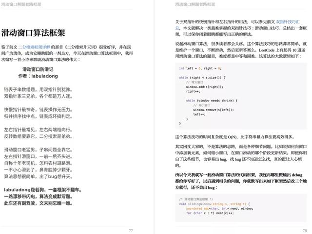 还有大名鼎鼎的滑动窗口技巧,书中不仅写了一套框架,甚至写了一首诗,把滑动窗口算法直接变成了默写题,相关问题直接套模板: