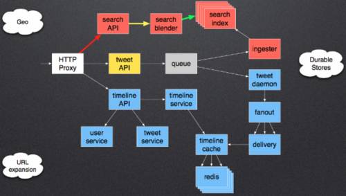 参考《TimelinesTwitter-QCon12.pdf》等众多文档。主要是推模式。Twitter的Timeline这种应用,和FB的Feed最大的区别,就是要解决fan-out的效率和全文搜索的效率。整体模块划分图: