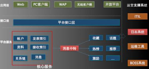 腾讯的积累,使得腾讯微博在平台化做的扎实。整个产品的“接口-服务”感觉清晰。在容灾容错方面更是比其它家(至少从文档上)高出了很多。集群建设,系统维护都沿袭了腾讯的积累,光海量日志的查询就用了Sphinx全文搜索。数据挖掘和分析(比如关系链分析、圈子挖掘、用户价值评估)也一直是腾讯的重点能力。