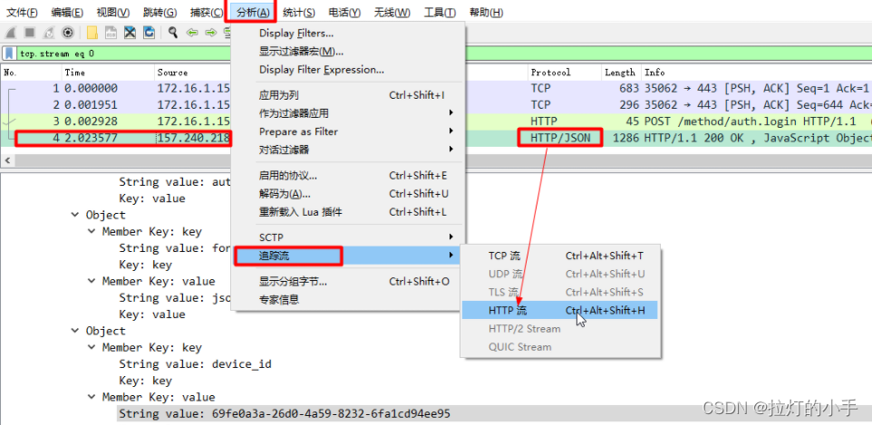 Wireshark打开,选择里面的某条数据内容使用分析->追踪流->分析抓包数据即可!如下图所示: