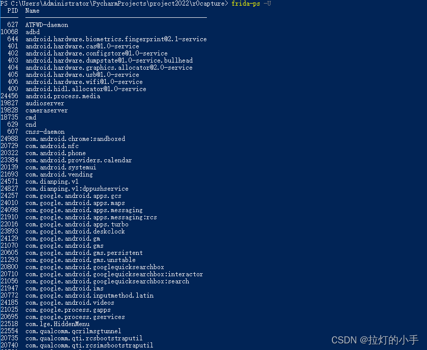 shell,运行frida-ps -U命令,即可显示手机中正在运行的进程。