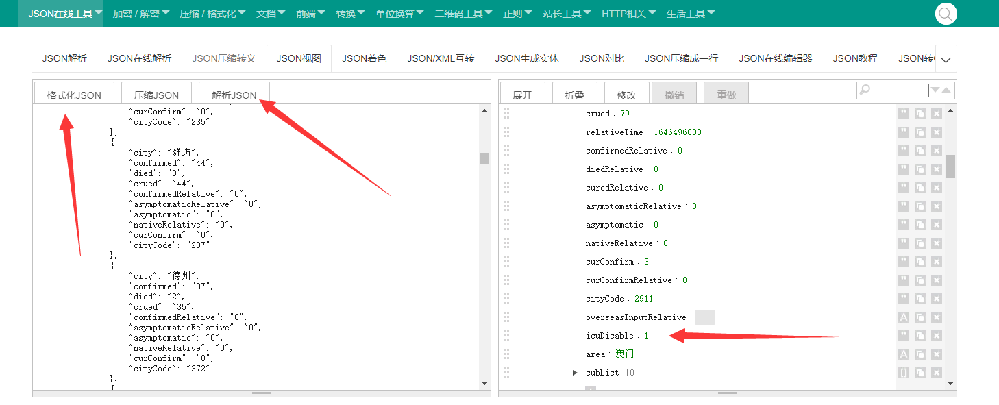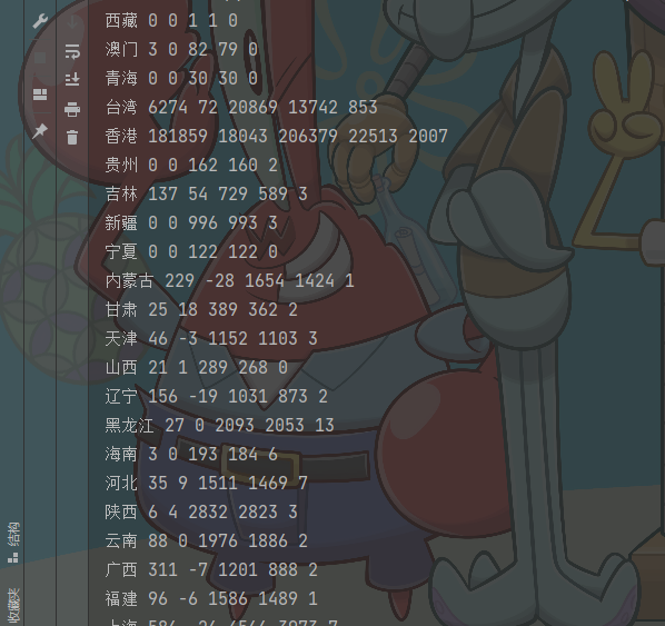 url = 'https://voice.baidu.com/act/newpneumonia/newpneumonia/?from=osari_aladin_banner'response = requests.get(url)~~~**2. 获取数据 网页源代码**~~~html_data = response.text# print(response.text)~~~**3. 解析数据**最烦的事情来了,就是提取里面的数据~~~str_data = re.findall('<script type="application\/json" id="captain-config">\{(.*)\}',html_data)[0]print(re.findall( '"component":\[(.*)\],',str_data)[0])~~~用工具去解析一下,在caseList里面就是我们想要的数据了~~~json_str = re.findall('"component":\[(.*)\],', html_data)[0] # 字符串# 字典类型取值, 转类型json_dict = eval(json_str)caseList = json_dict['caseList']for case in caseList: area = case['area'] # 城市 curConfirm = case['curConfirm'] # 当前确诊 curConfirmRelative = case['curConfirmRelative'] # 新增人数 confirmed = case['confirmed'] # 累计确诊 crued = case['crued'] # 治愈人数 died = case['died'] # 死亡人数~~~**4. 保存数据**~~~with open('data.csv', mode='a', newline='') as f: csv_writer = csv.writer(f) csv_writer.writerow([area, curConfirm, curConfirmRelative, confirmed, crued, died])~~~**运行代码,得到数据**