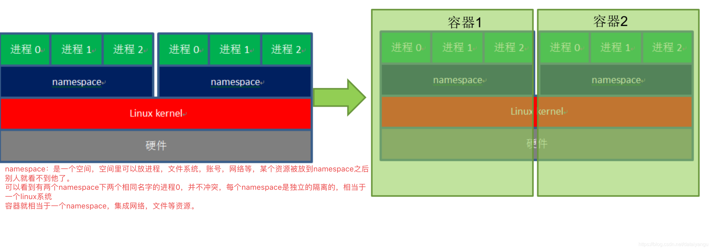 namespace:是一个空间,空间里可以放进程,文件系统,账号,网络等,某个资源被放到namespace之后