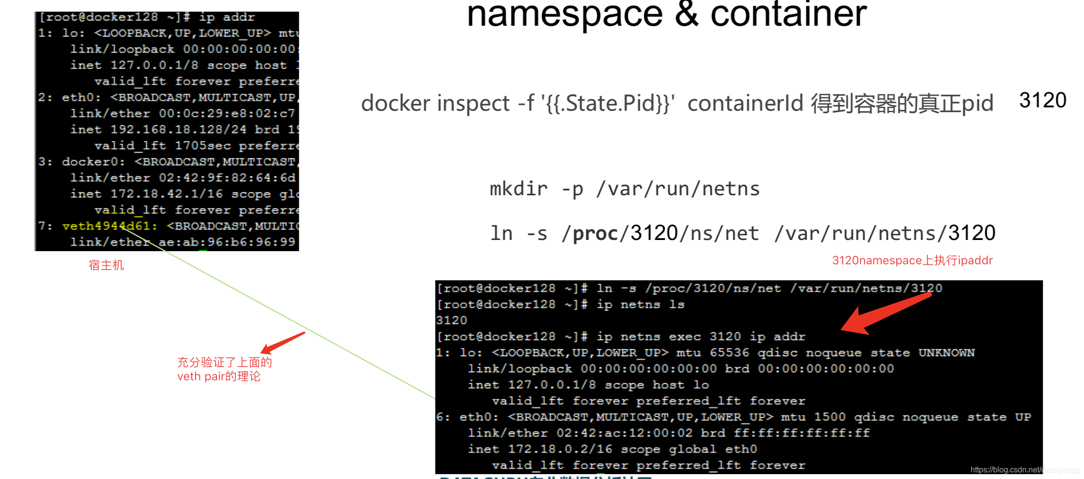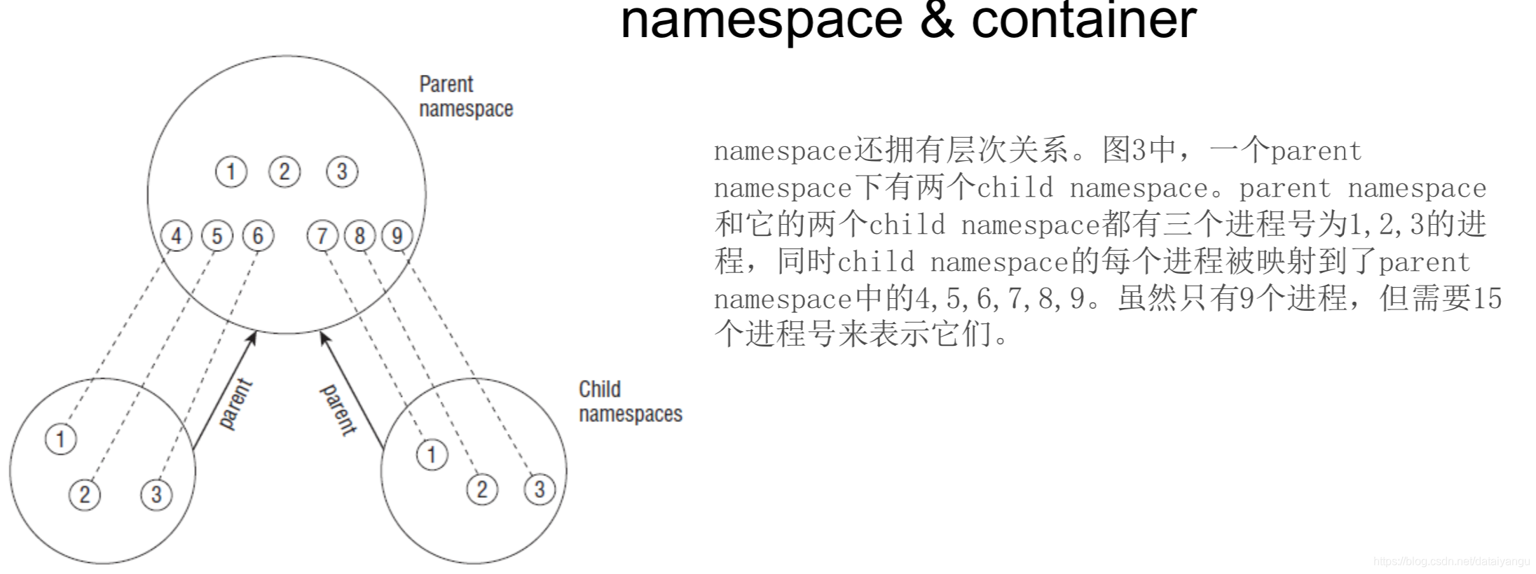 docker中的namespace和pid是一样的,进程的编号就是namespace名称,这里的进程指的是containner本身的pid,不是containert里面应用的pid。