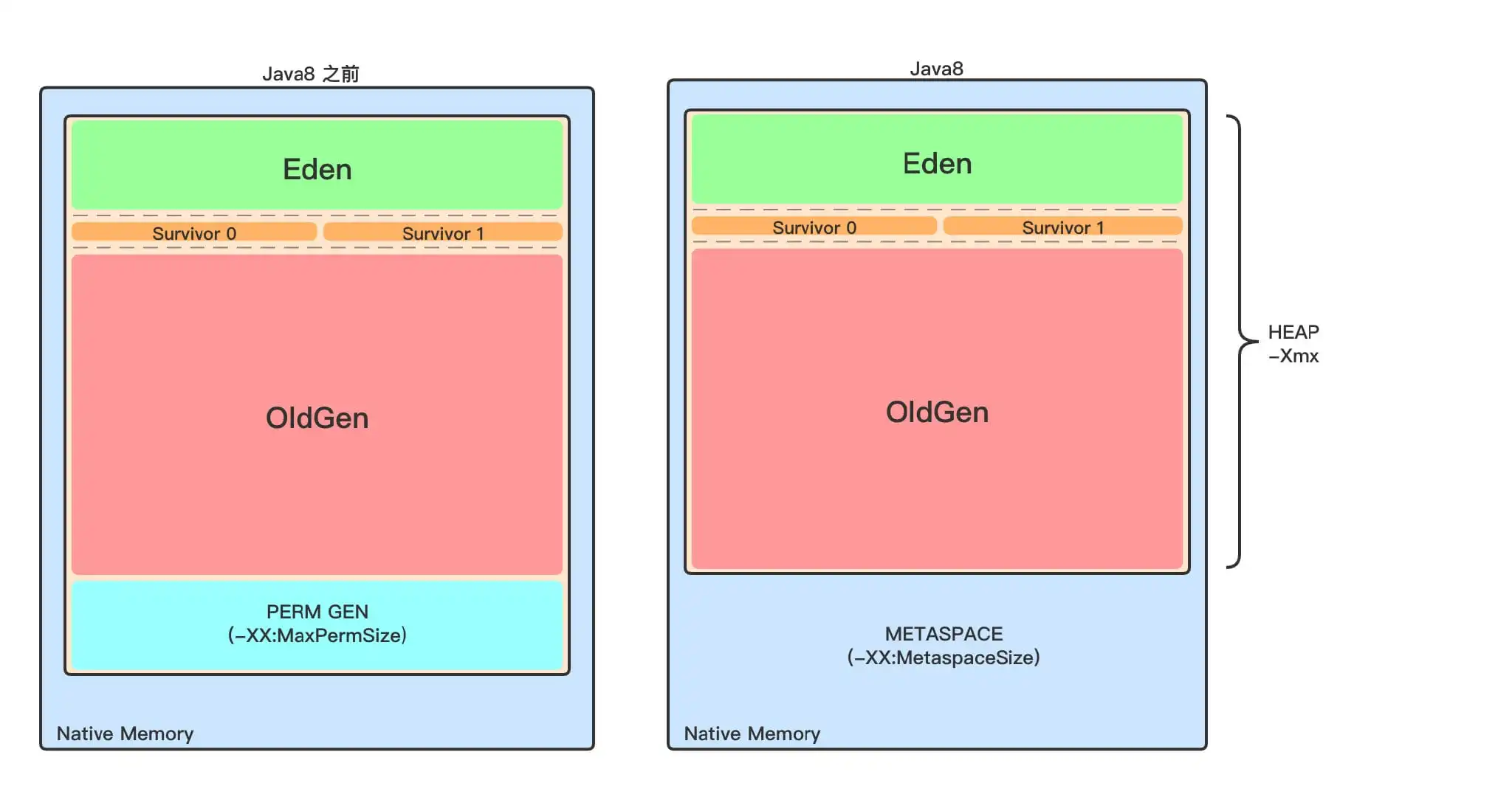 年轻代是所有新对象创建的地方。这种垃圾收集称为 MinorGC。年轻一代被分为三个部分:伊甸园(Eden Memory)和两个幸存区(Survivor Memory,被称为 from/to 或 s0/s1),默认比例是 8:1:1。大部分对象的生命周期都很短,创建后很快就会变成垃圾对象,所以年轻代的垃圾回收操作比较频繁。
