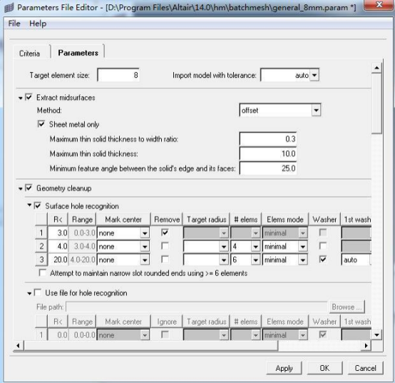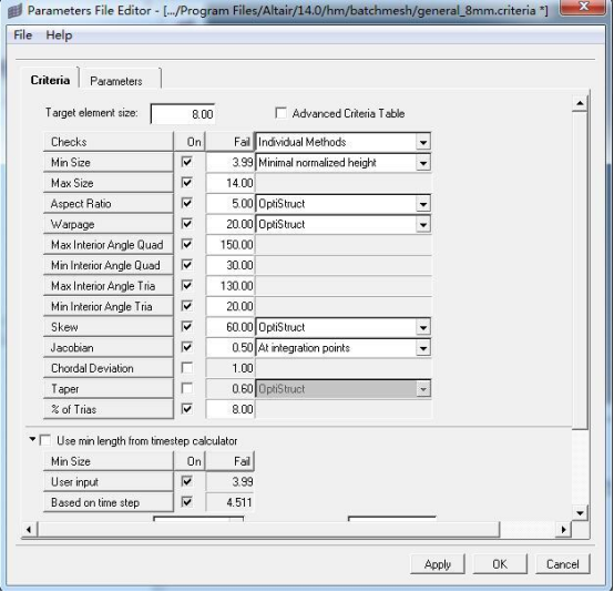 在 Criteria 面板下,可以对单元尺寸,单元质量评价标准等各类项目进行设置。Advanced Criteria Tab提供了基于 QI 评价的单元质量高级控制,不过很多情况下,Criteria 面板下的基本参数控制,就可以得到高质量的二维网格。针对显式求解器(Explicit Solvers),Criteria 面板下还提供了时间步长控制功能。如果开启此功能,那么 Batch Mesher 将在全局控制生成的最小单元尺寸。基于时间步长估算的最小单元尺寸控制功能的优先级高于 Criteria File 文件中其他单元质量控制参数。而 Parameter File 则提供了所有基于几何特征的网格形态控制功能。