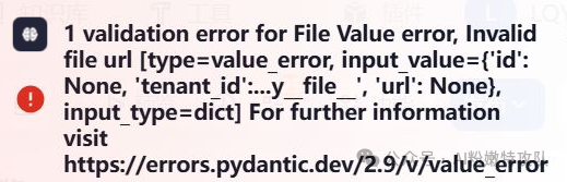 1 validation error for File Value error, Invalid file url [type=value_error,input value={id: None,'tenant id'..y_file_,'url':None), input type=dict] For further information visit https://errors.pydantic.dev/2.9/v/value_error