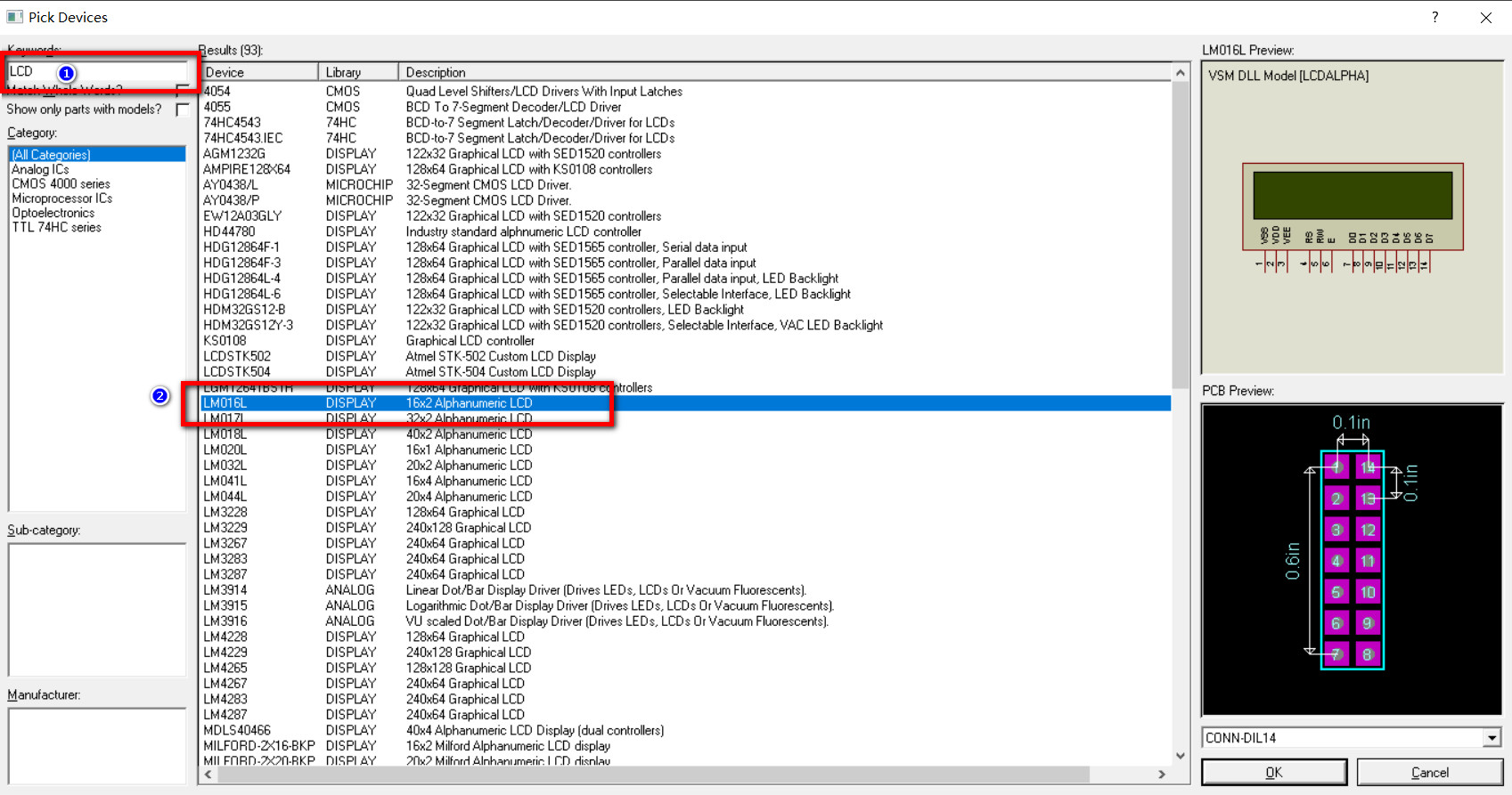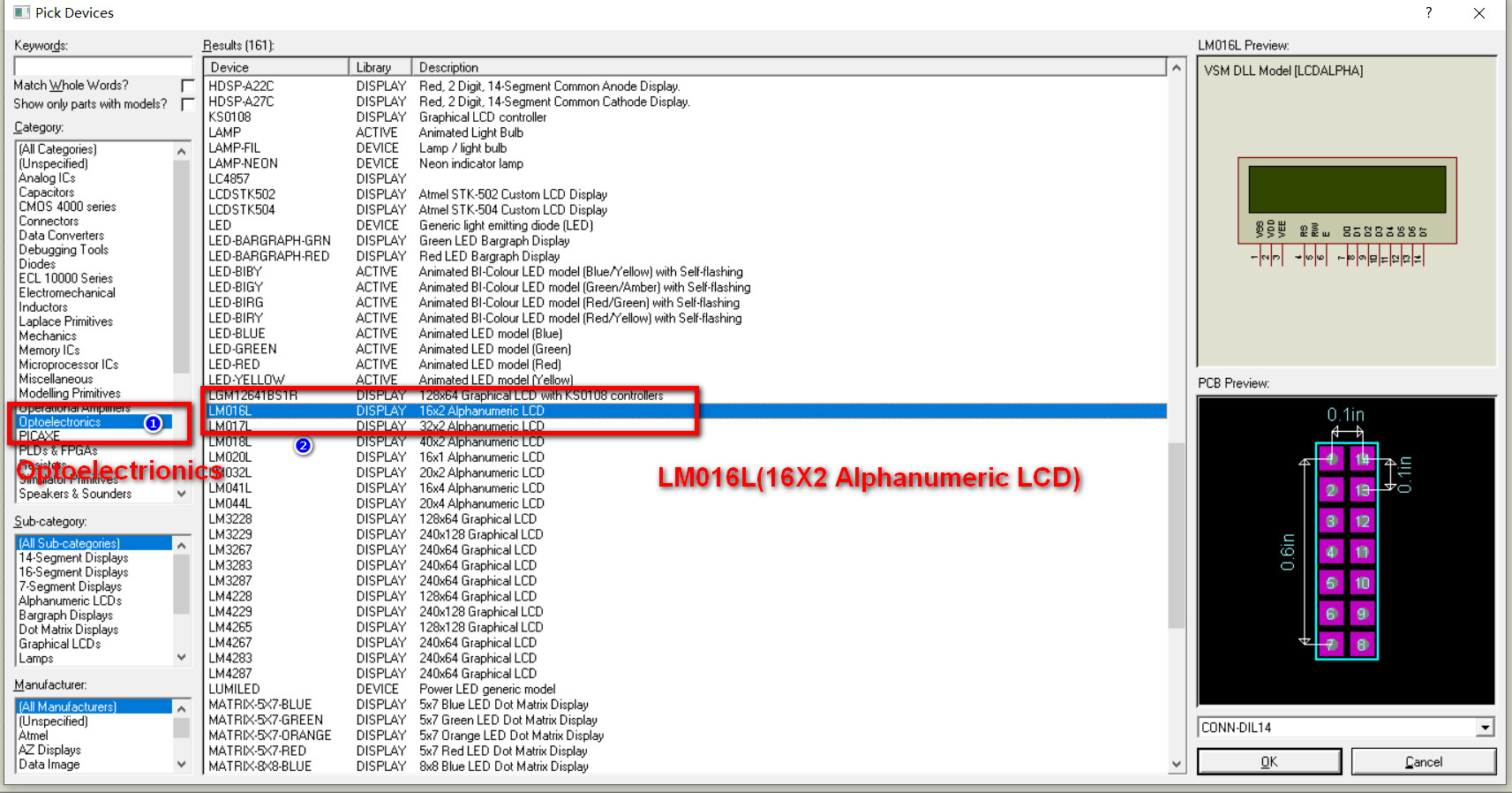 (1)位置法:category >> optoelectrionic >> LM016L(16X2 Alphanumeric LCD)