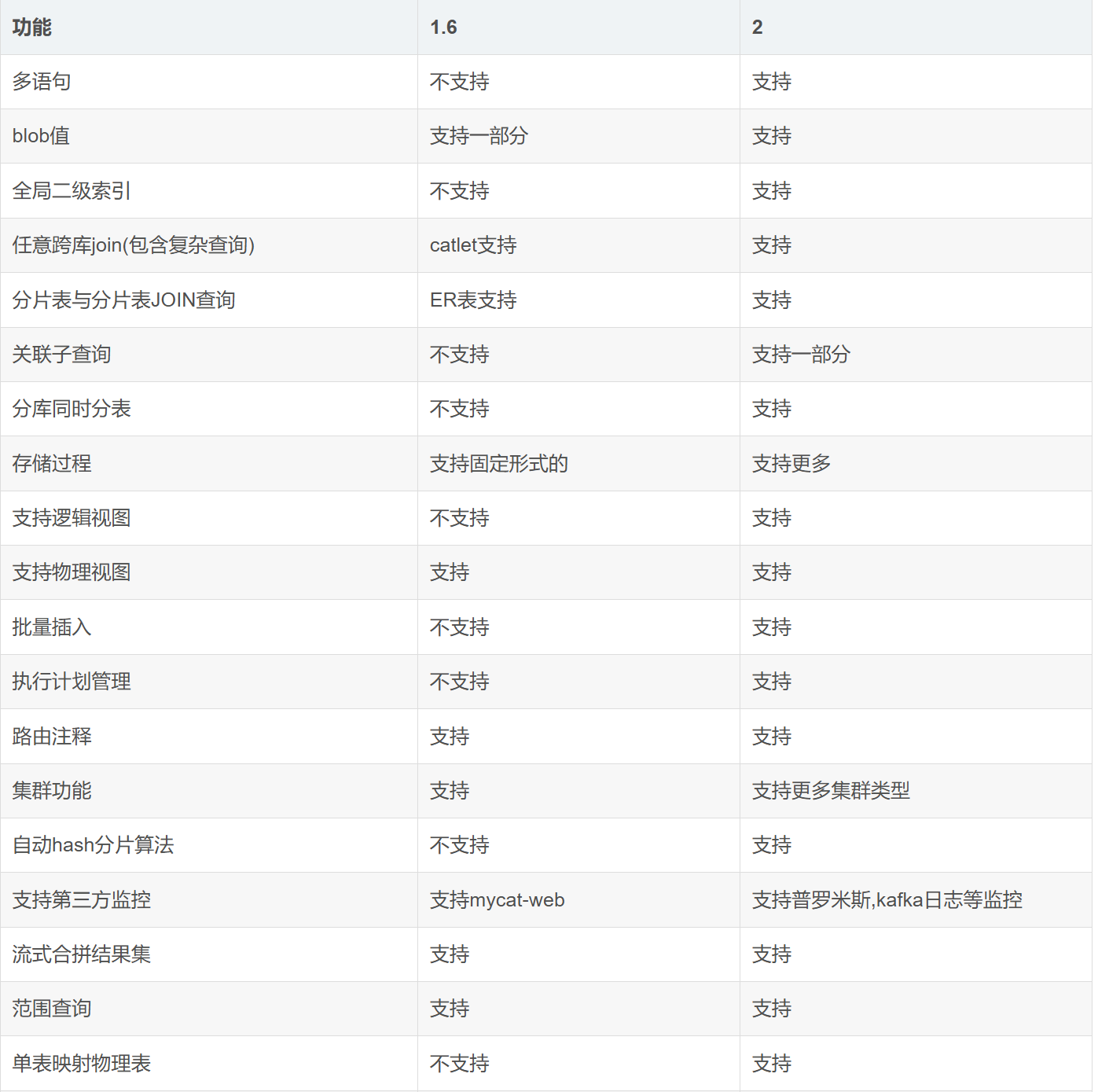 1.6 MyCAT1.x 和 MyCAT2 功能对比