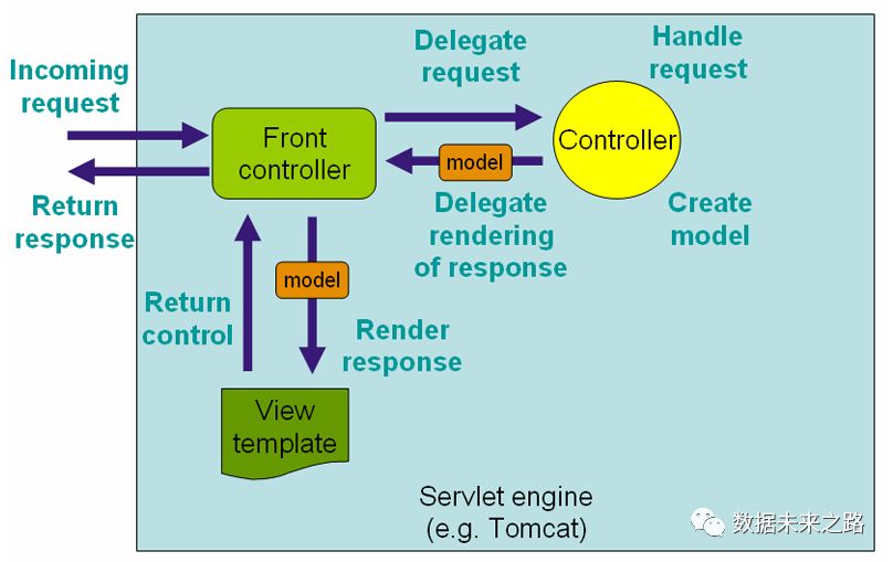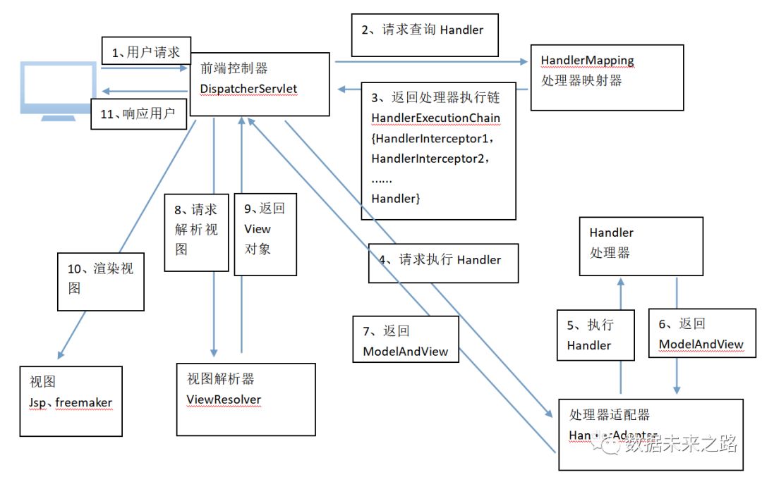 用户请求到达前端控制器,它就相当于mvc模式中的c,dispatcherServlet是整个流程控制的中心,由它调用其它组件处理用户的请求,dispatcherServlet的存在降低了组件之间的耦合性。