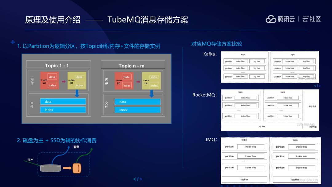 JMQ是按Topic定义数据文件,但每个Partition定义新的文件,它比RocketMQ更宽泛一点,它数据不会集中到一个文件,它是按照Topic来的,解决了RokcetMQ的一些问题。TubeMQ是怎样呢?TubeMQ是一个Topic一个数据文件,不同的Topic有不同的文件,我们没有Partition。我们都是按Topic来定义存储单元的,一个数据文件 + 一个索引文件。大家可以去分析一下,它们是各有特点,不同的场景下的表现特征是不一样的,包括你的硬件场景,其实还是有很大差异的。