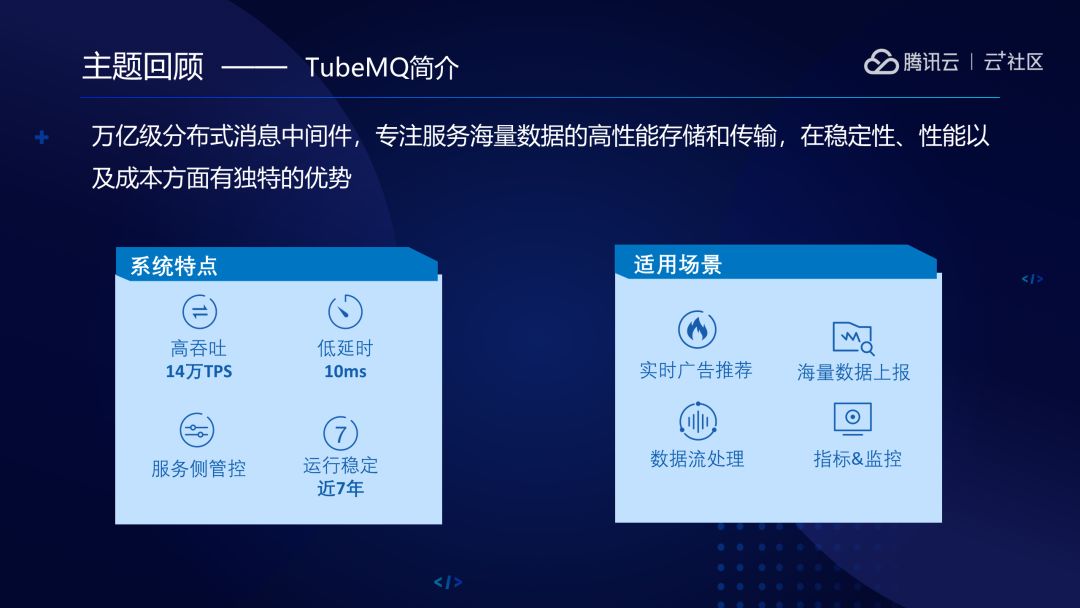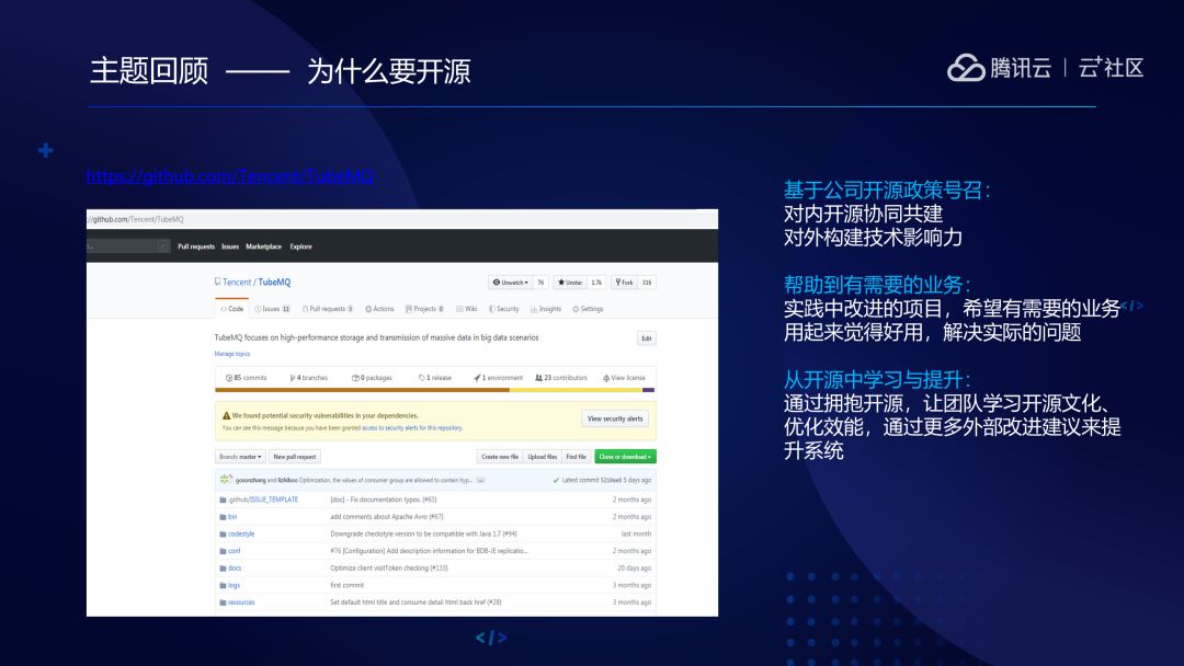 所以我们把它捐献给了基金会。为什么选择Apache呢?因为我们是专注于大数据场景的MQ,而Apache是基于大数据这个生态最为出名的社区,而我们也同样也受惠于这个生态,所以理所当然就想回馈社区,将项目捐献给Apache。前段时间TubeMQ已经成为了Apache的孵化项目。