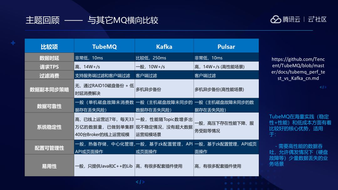 下图的这个表格是TubeMQ与其他MQ横向比较的数据情况,我们项目是开源的,大家如果感兴趣的话可以直接去验证一下。总的来说,TubeMQ比较适合需要高性能、低成本又容许极端情况下有数据损失的场景,是经得起实践考验的。