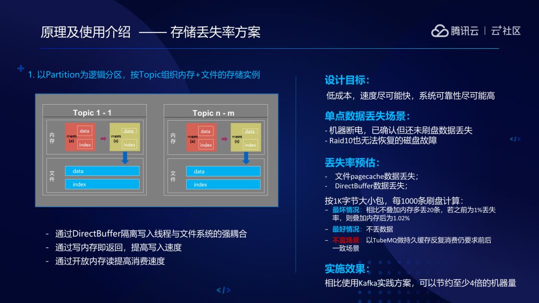 因为我们做的是有损服务,有损的服务是怎么回事呢?就是我们在机器断电、没有存储或者没有刷盘的情况下,数据就会丢失,在磁盘RAID10都无法恢复的磁盘故障情况下数据也会丢失。除了这两种情况,其他的情况都不会丢。