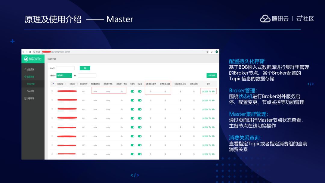 TubeMQ的管控模块Master,是基于BDB嵌入式数据库进行集群的Broker节点管理。各个Broker配置的Topic信息的数据存储,只要在标红的操作栏里操作,就会有一个状态告知操作者目前处于什么样的过程,是基于执行操作还是只读只写或者是可读写的情况。还可以通过这个页面查询。本系统在Windows上面就可以运行起来,欢迎大家去试用。