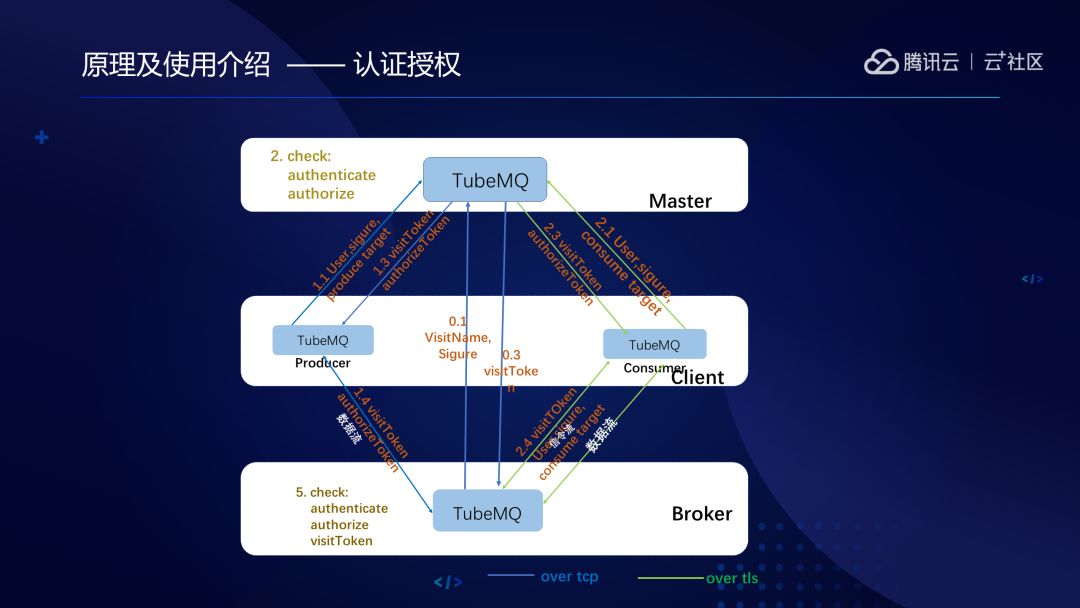 TubeMQ的认证授权设计和传统的也不太一样,因为我们把TubeMQ的认证机做了重新的定义,具体可见下图。