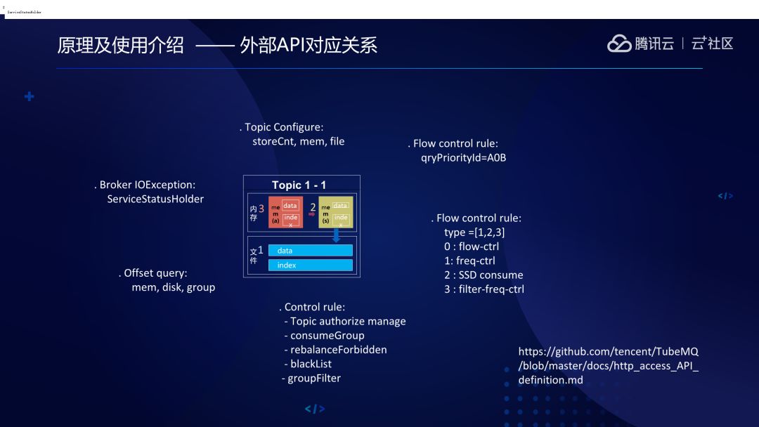 TubeMQ所有的管控逻辑包括所有的API接口都是围绕着它的存储来做的,包括它的Topic的配置和流控的处理和数据的查询、API的库存等等。下图所示的是TubeMQ最核心的API接口定义,主要分为4个章节。如果只是使用的话,直接通过管控台操控就可以了,但如果你要精细化地去调控系统,就需要去了解API的定义了。