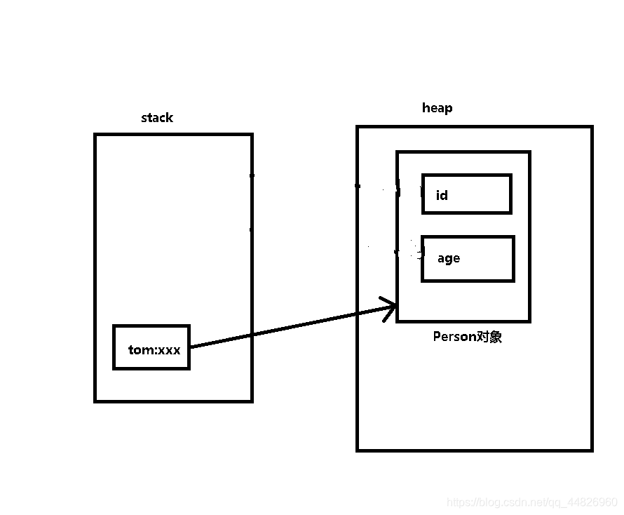 注:图中局部变量tom的内容为xxx,xxx实际为Person对象在堆中的地址,在此处用xxx