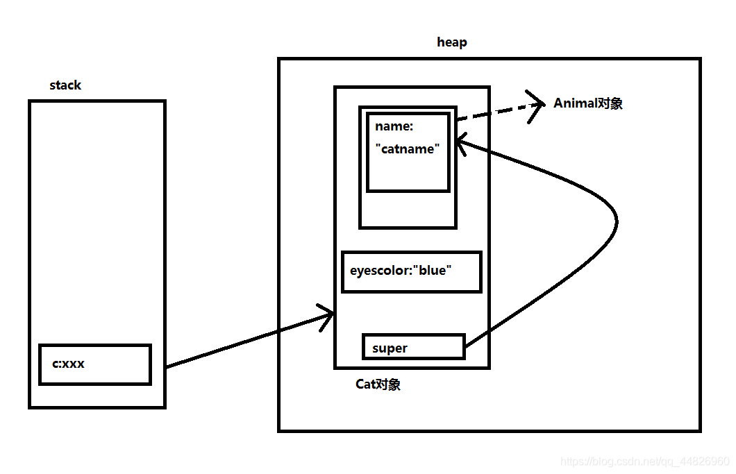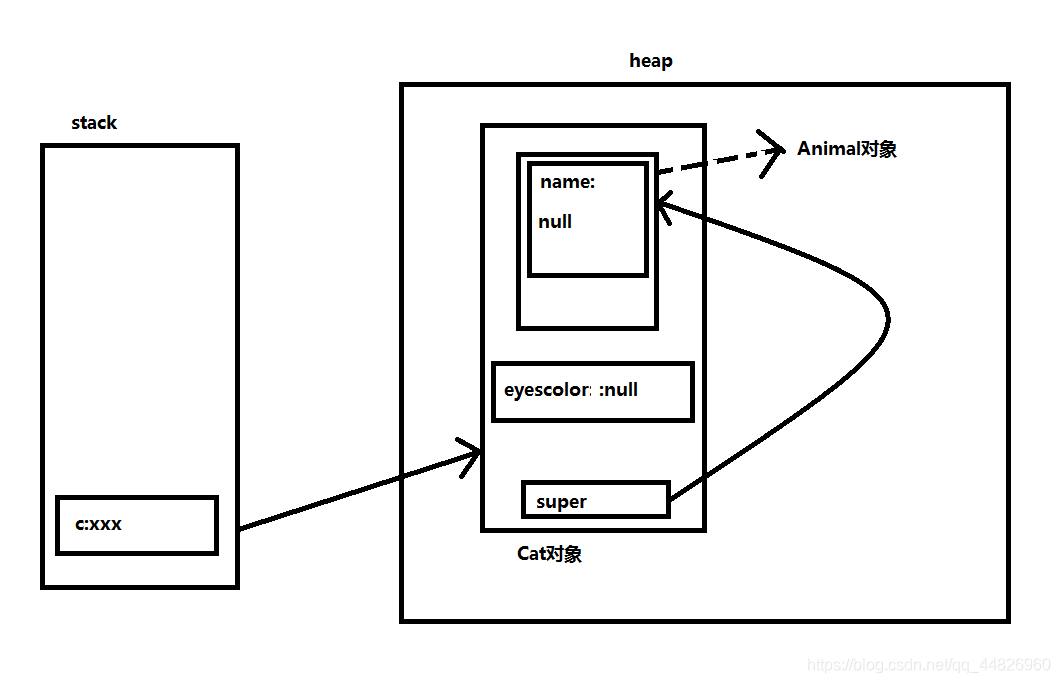 (1)new出来的Cat对象中包含Animal对象,Animal对象有一个成员变量name,自动初始化为null,C对象有一个成员变量eyescolor,自动初始化为null。