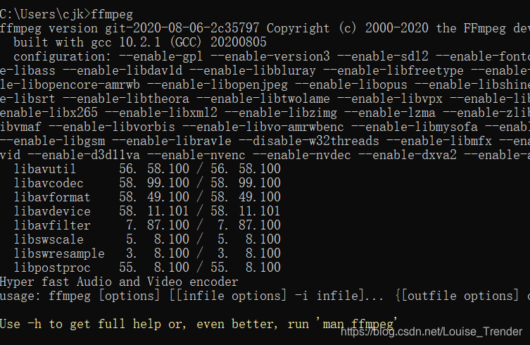 在cmd输入ffmpeg,出现如图现象,即为安装成功