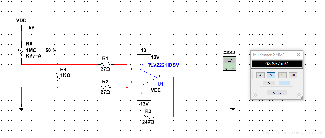 示例分析: 假设这是一个理想放大电路,并且待测电路的电流为100uA(500KΩ)时,