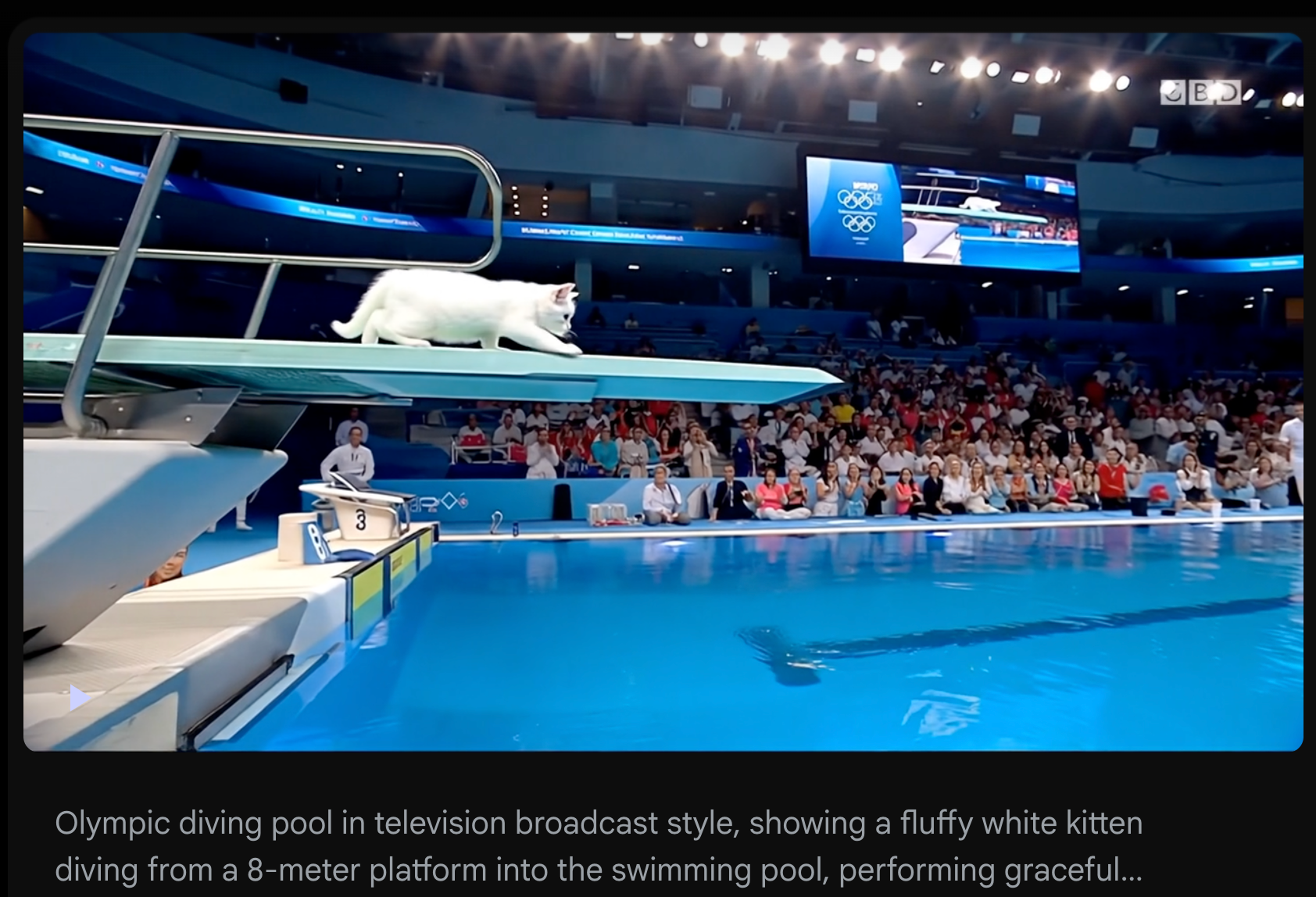 还是使用之前小猫奥运会的提示词,这是 Veo 2 Fast 模型的生成效果: