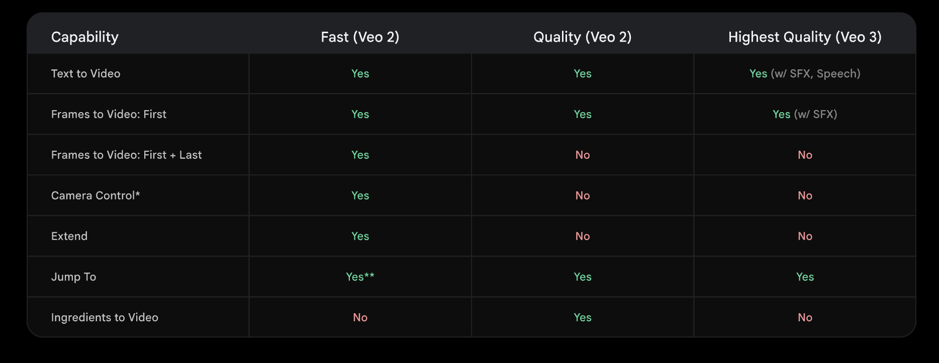 尾图我就先不指定了,因为指定尾图的话,就没办法使用 Veo 3 模型,参考官方提供的模型能力支持表: