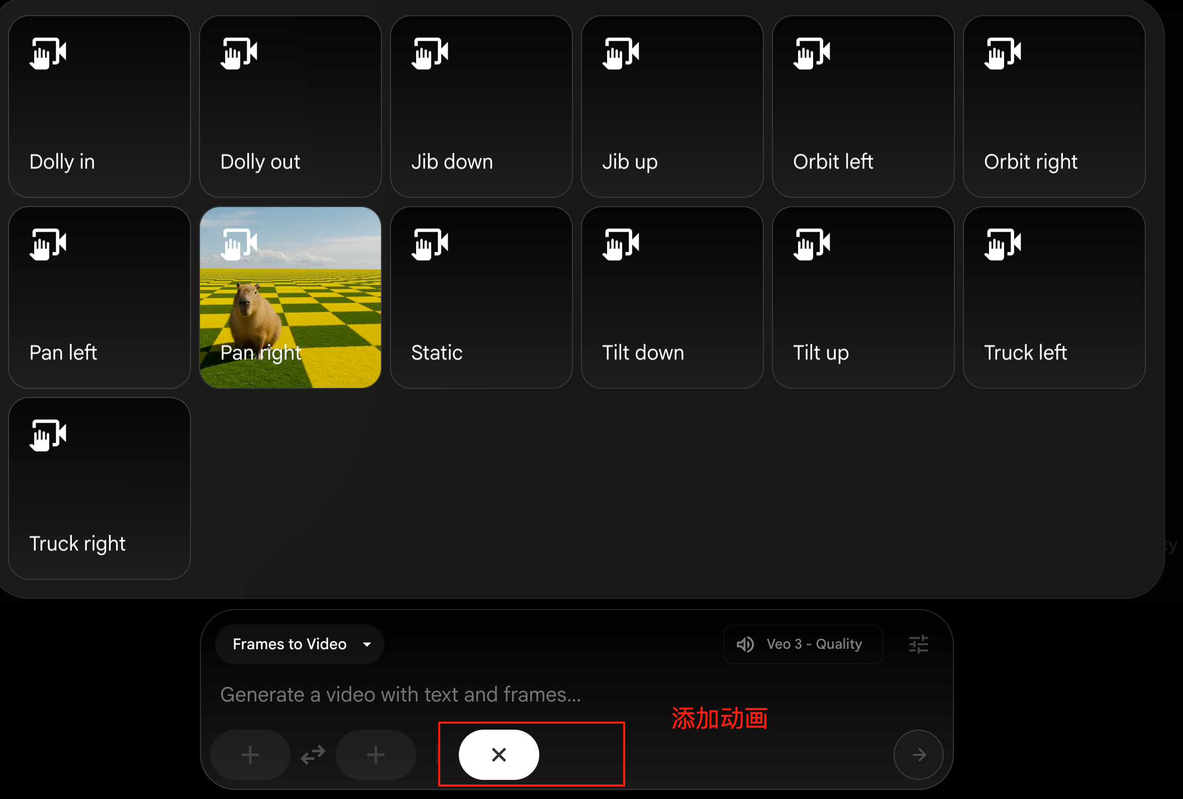 还可以指定生成的动画,不过指定后也无法使用 Veo 3 模型了,我们完全可以把视频动画描述写到提示词中。